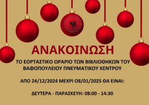 ΔημοσιεύσειςΘέλω να ενημερωθώΑνακοινώσειςΒΠΚ: Εορταστικό ωράριο λειτουργίας βιβλιοθηκών Βαφοπουλείου Πνευματικού Κέντρου ΑνακοινώσειςΔιεύθυνση Βαφοπουλείου Πνευματικού Κέντρου και Αρχείων ΒΠΚ: Εορταστικό ωράριο λειτουργίας βιβλιοθηκών Βαφοπουλείου Πνευματικού Κέντρου 23/12/2024 12:06 FacebookTwitterLinkedinEmailΤυπώνωCopy URL ΤΕΛΕΥΤΑΙΕΣ ΑΝΑΡΤΗΣΕΙΣ Δημοτική Επιτροπή 1η ΤΑΚΤΙΚΗ ΣΥΝΕΔΡΙΑΣΗ ΔΗΜΟΤΙΚΗΣ ΕΠΙΤΡΟΠΗΣ 7-1-2026 02/01/2026 14:55 Αποκεντρωμένες Υπηρεσίες Α' Δημοτικής Κοινότητας 22Η ΤΑΚΤΙΚΗ ΣΥΝΕΔΡΙΑΣΗ 11 ΔΕΚΕΜΒΡΙΟΥ 2025 30/12/2025 15:03 Αποκεντρωμένες Υπηρεσίες Α' Δημοτικής Κοινότητας 21Η ΤΑΚΤΙΚΗ ΣΥΝΕΔΡΙΑΣΗ 25 ΝΟΕΜΒΡΙΟΥ 2025 30/12/2025 14:53 Προηγούμενο άρθροΛειτουργία Ταμειακής Υπηρεσίας Δ΄Κ οινότηταςΕπόμενο άρθροΠίνακες αποτελεσμάτων της υπ’ αρ. ΣΜΕ 8/2024 Πρόσκλησης Εκδήλωσης Ενδιαφέροντος