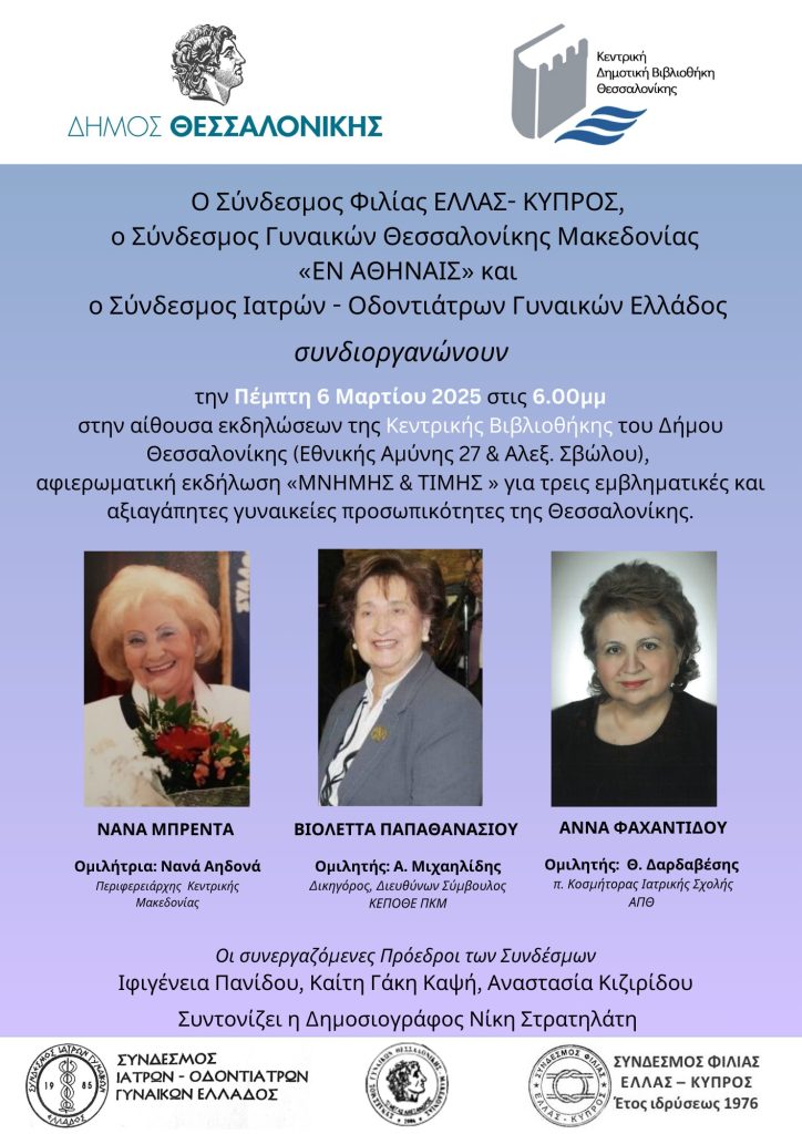 Ο Σύνδεσμος Φιλίας ΕΛΛΑΣ- ΚΥΠΡΟΣ, ο Σύνδεσμος Γυναικών Θεσσαλονίκης Μακεδονίας «ΕΝ ΑΘΗΝΑΙΣ» και ο Σύνδεσμος Ιατρών – Οδοντιάτρων Γυναικών Ελλάδος συνδιοργανώνουν την Πέμπτη 6 Μαρτίου 2025 στις 18.00 στην Δημοτική Βιβλιοθήκη Θεσσαλονίκης, αφιερωματική εκδήλωση «ΜΝΗΜΗΣ & ΤΙΜΗΣ» για τρεις εμβληματικές και αξιαγάπητες γυναικείες προσωπικότητες της Θεσσαλονίκης, που με το έργο και την προσωπικότητά τους, άφησαν το δικό τους προσωπικό στίγμα στην πόλη. Έφυγαν και οι τρείς το 2019, αφήνοντας πίσω τους, δυσαναπλήρωτο κενό αλλά και μέγα επιστημονικό, ιστορικό, εθελοντικό, πολιτιστικό, παραδοσιακό και ανθρωπιστικό έργο στην Κοινωνία της Θεσσαλονίκης, άξιο προς παραδειγματισμό και μίμηση.