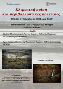 Το Βαφοπούλειο Πνευματικό Κέντρο διοργανώνει εκδήλωση με τίτλο «Κλιματική κρίση και περιβαλλοντικές πολιτικές» την Πέμπτη 14 Νοεμβρίου 2024, στις 19:00, στο θέατρο (Γ. Βαφόπουλου 5).