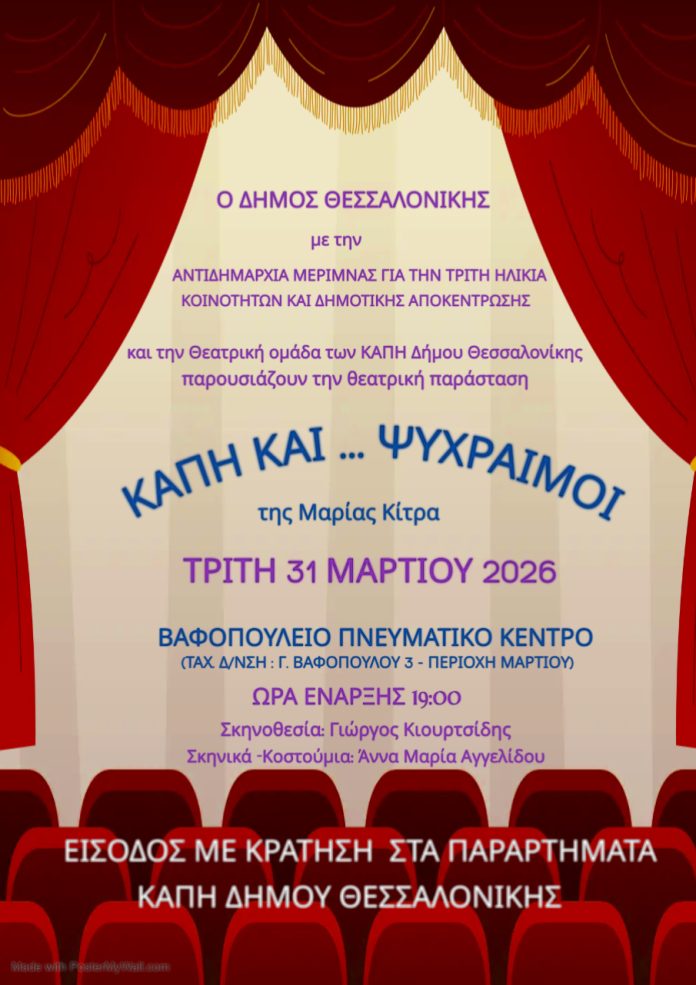 Ο Δήμος Θεσσαλονίκης, η Αντιδημαρχία Μέριμνας για την Τρίτη Ηλικία, Κοινοτήτων και Δημοτικής Αποκέντρωσης και η Θεατρική Ομάδα των ΚΑΠΗ Δήμου Θεσσαλονίκης παρουσιάζουν τη θεατρική παράσταση «ΚΑΠΗ και… Ψύχραιμοι» της Μαρίας Κίτρα, σήμερα Τρίτη 31 Μαρτίου 2026, στις 19:00, στο Βαφοπούλειο Πνευματικό Κέντρο.