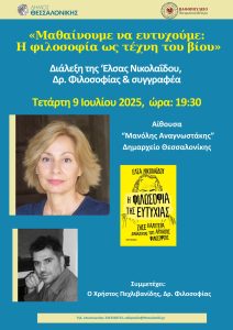 Το Βαφοπούλειο Πνευματικό Κέντρο διοργανώνει την Τετάρτη 9 Ιουλίου 2025, διάλεξη με τίτλο «Μαθαίνουμε να ευτυχούμε: Η φιλοσοφία ως τέχνη του βίου», με κύρια ομιλήτρια την Έλσα Νικολαΐδου, Δρ. Φιλοσοφίας και συγγραφέα.