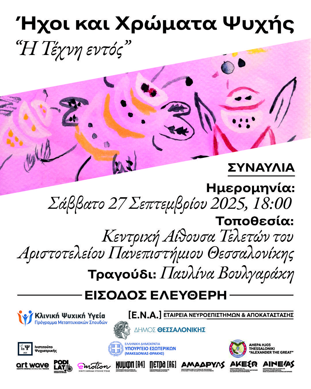 Μια ιδιαίτερη συναυλία, αφιερωμένη στην ψυχική υγεία, με τίτλο «Ήχοι και Χρώματα Ψυχής: Η Τέχνη εντός» διοργανώνεται από την Εταιρεία Νευροεπιστημών και Αποκατάστασης [Ε.Ν.Α.] σε συνεργασία με το Μεταπτυχιακό Πρόγραμμα Σπουδών “Κλινική Ψυχική Υγεία” του Α.Π.Θ. το Σάββατο 27 Σεπτεμβρίου 2025, στις 18:00, στην Κεντρική Αίθουσα Τελετών του Α.Π.Θ.