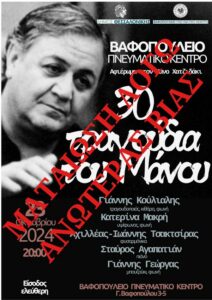 Η μουσική εκδήλωση – αφιέρωμα στον Μάνο Χατζιδάκι με τίτλο «30 τραγούδια του Μάνου» που ήταν προγραμματισμένη να γίνει στις 23 Οκτωβρίου 2024, στο Βαφοπούλειο Πνευματικό Κέντρο, ματαιώνεται λόγω ανωτέρας βίας. Σε περίπτωση επαναπροσδιορισμού της θα υπάρξει σχετική ενημέρωση.