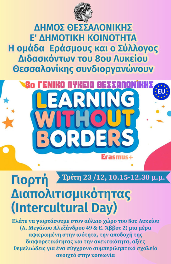 Ο Δήμος Θεσσαλονίκης και η Ε΄ Δημοτική Κοινότητα συνδιοργανώνουν με την ομάδα Erasmus και τον Σύλλογο Διδασκόντων του 8ου Λυκείου Θεσσαλονίκης (Λεωφόρος Μεγάλου Αλεξάνδρου 49), Γιορτή Διαπολιτισμικότητας (Intercultural Day) την Τρίτη 23 Δεκεμβρίου 2025, και ώρα 10:15πμ – 12:30μμ.