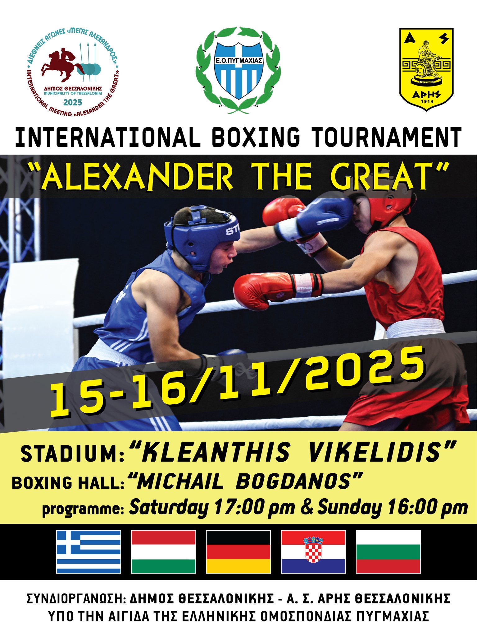 Ο Δήμος Θεσσαλονίκης και η Αντιδημαρχία Αθλητισμού, Νεολαίας & Εθελοντισμού συνδιοργανώνουν με το Τμήμα Πυγμαχίας του Α.Σ. Άρη και υπό την αιγίδα της Ελληνικής Ομοσπονδίας Πυγμαχίας το Διεθνές Τουρνουά Πυγμαχίας «Μέγας Αλέξανδρος».