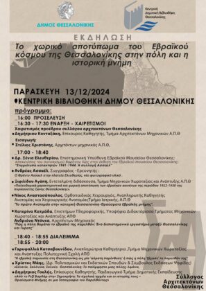- Παρασκευή 13/12 στις 16:00, επιστημονική εσπερίδα «Το χωρικό αποτύπωμα του Εβραϊκού κόσμου στην πόλη της Θεσσαλονίκης και η ιστορική μνήμη»