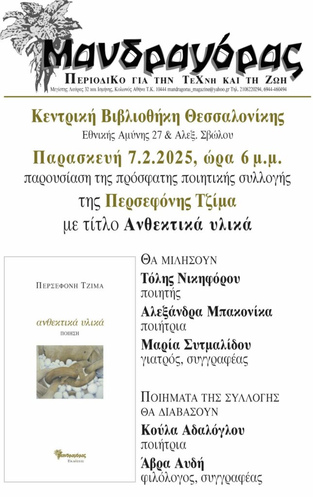 Οι εκδόσεις Μανδραγόρας και η Κεντρική Δημοτική Βιβλιοθήκη Θεσσαλονίκης, παρουσιάζουν την Παρασκευή 7 Φεβρουαρίου 2025 στις 18.00 στον χώρο της Βιβλιοθήκης (Εθνικής Αμύνης 27 & Αλεξ. Σβώλου) την πρόσφατη ποιητική συλλογή της Περσεφόνης Τζίμα «Ανθεκτικά υλικά».