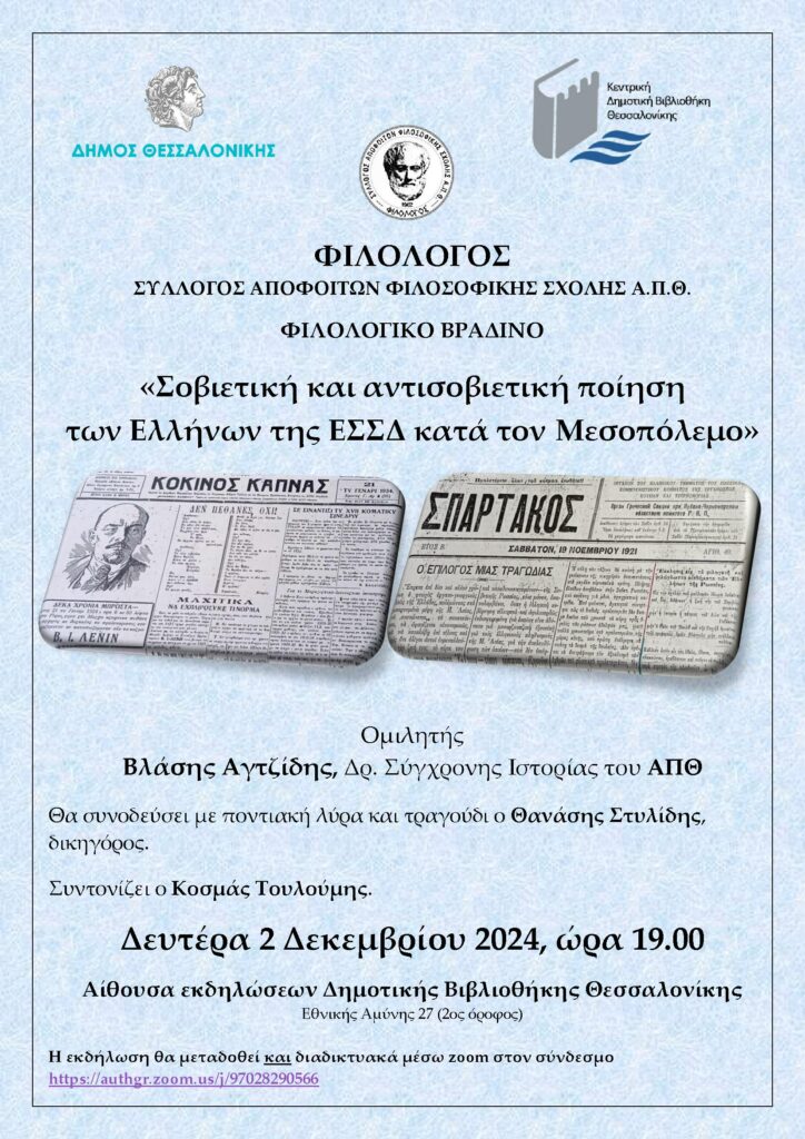 Ο Σύλλογος Αποφοίτων Φιλοσοφικής Σχολής Α.Π.Θ. «Φιλόλογος» και η Κεντρική Βιβλιοθήκη οργανώνουν τη Δευτέρα 2 Δεκεμβρίου 2024 στις 19.00, φιλολογικό βραδινό με θέμα «Σοβιετική και αντισοβιετική ποίηση των Ελλήνων της ΕΣΣΔ κατά τον Μεσοπόλεμο». Ομιλητής θα είναι ο Βλάσης Αγτζίδης, Δρ. Σύγχρονης Ιστορίας του Τμήματος Ιστορίας και Αρχαιολογίας της Φιλοσοφικής Σχολής ΑΠΘ.