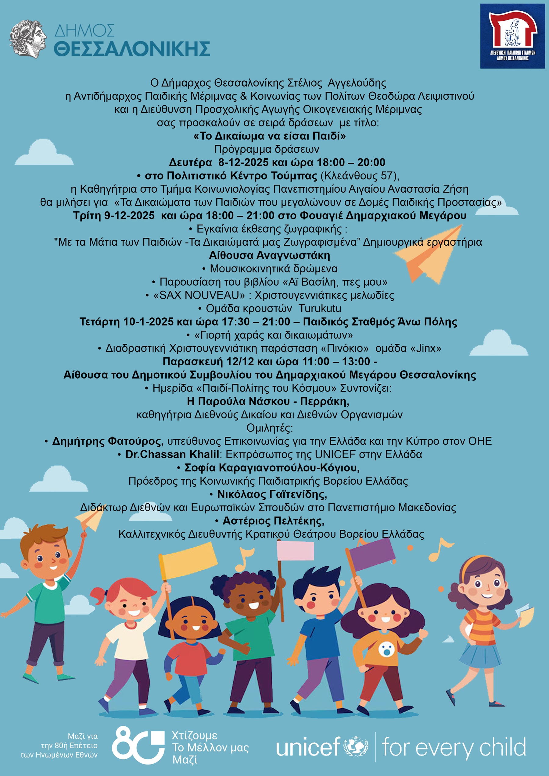 Ο Δήμος Θεσσαλονίκης, η Αντιδημαρχία Παιδικής Μέριμνας, Οικογένειας και Κοινωνίας των Πολιτών και η Διεύθυνση Προσχολικής Αγωγής και Οικογενειακής Μέριμνας, ανακοινώνουν τη διοργάνωση σειράς δράσεων και εκδηλώσεων, αφιερωμένων στα Δικαιώματα του Παιδιού, που θα πραγματοποιηθούν από τις 8 έως τις 12 Δεκεμβρίου 2025, στο Δημαρχιακό Μέγαρο.