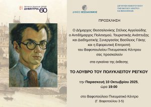 Το Βαφοπούλειο Πνευματικό Κέντρο διοργανώνει στο πλαίσιο των 60ων ΔΗΜΗΤΡΙΩΝ 2025 την έκθεση «Το Λούβρο του Πολύκλειτου Ρέγκου» από τις 10 Οκτωβρίου έως τις 05 Νοεμβρίου 2025. Τα εγκαίνια της έκθεσης θα πραγματοποιηθούν την Παρασκευή 10 Οκτωβρίου 2025, στις 19:00, στην αίθουσα εκθέσεων του Πνευματικού Κέντρου (5ος όροφος, Γ. Βαφόπουλου 3).