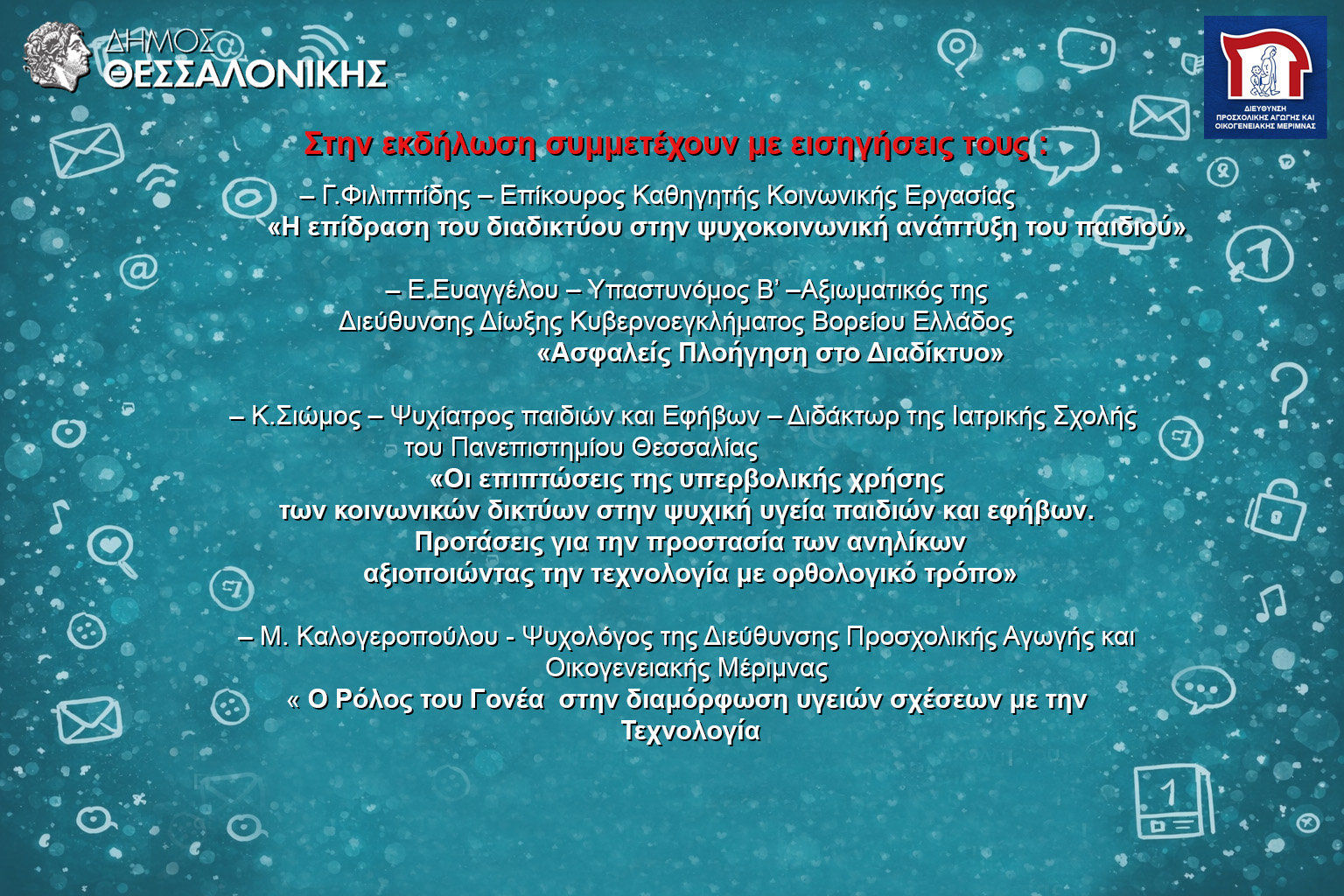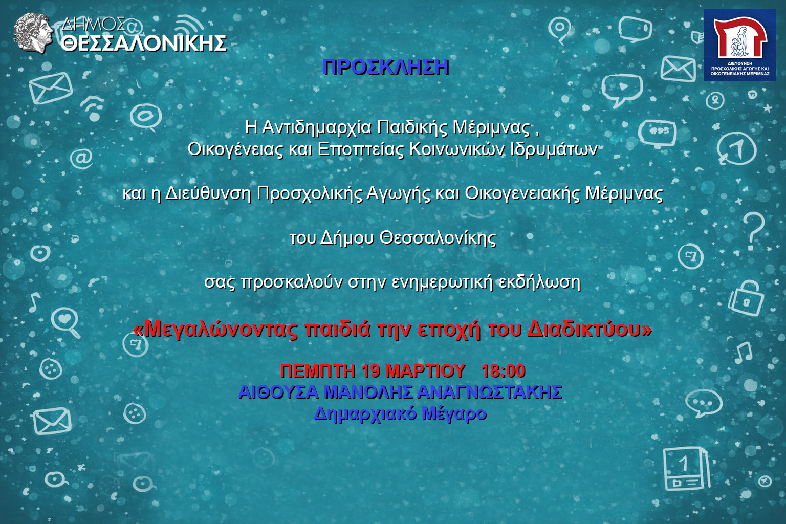 Ο Δήμαρχος Θεσσαλονίκης Στέλιος Αγγελούδης, ο Αντιδήμαρχος Παιδικής Μέριμνας, Οικογένειας και Εποπτείας Κοινωνικών Ιδρυμάτων, Γεώργιος Αρβανίτης και η Διεύθυνση Προσχολικής Αγωγής και Οικογενειακής Μέριμνας, σας προσκαλούν στην ενημερωτική εκδήλωση με τίτλο «Μεγαλώνοντας παιδιά την εποχή του Διαδικτύου».