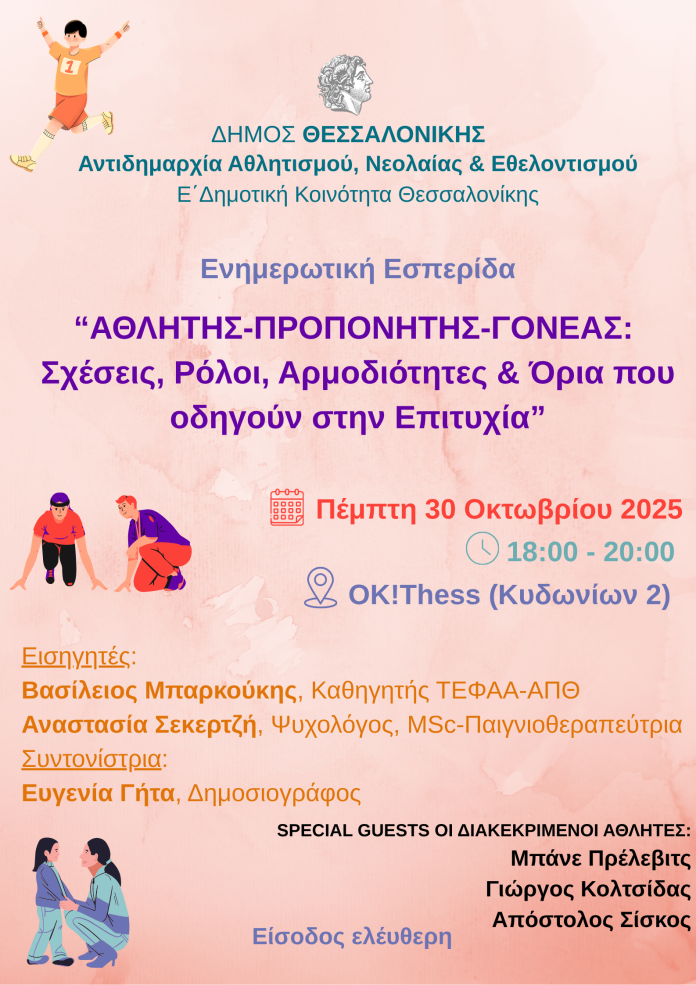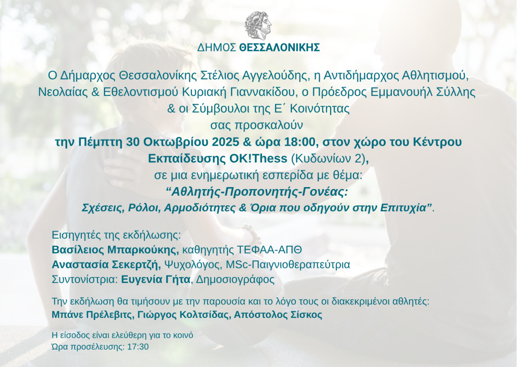 Ο Δήμος Θεσσαλονίκης, η Αντιδημαρχία Αθλητισμού, Νεολαίας & Εθελοντισμού και η Ε’ Δημοτική Κοινότητα, διοργανώνουν ενημερωτική εκδήλωση με θέμα: «Αθλητής – Προπονητής – Γονέας: Σχέσεις, ρόλοι, αρμοδιότητες & όρια που οδηγούν στην επιτυχία».