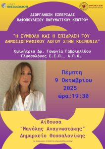 εσπερίδα με τίτλο «Η συμβολή και η επίδραση του δημοσιογραφικού λόγου στην κοινωνία» , με ομιλήτρια την Δρ. Γεωργία Γαβριηλίδου, Γλωσσολόγο Ε.Ε.Π., Α.Π.Θ.