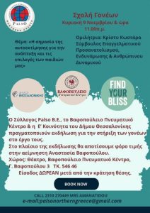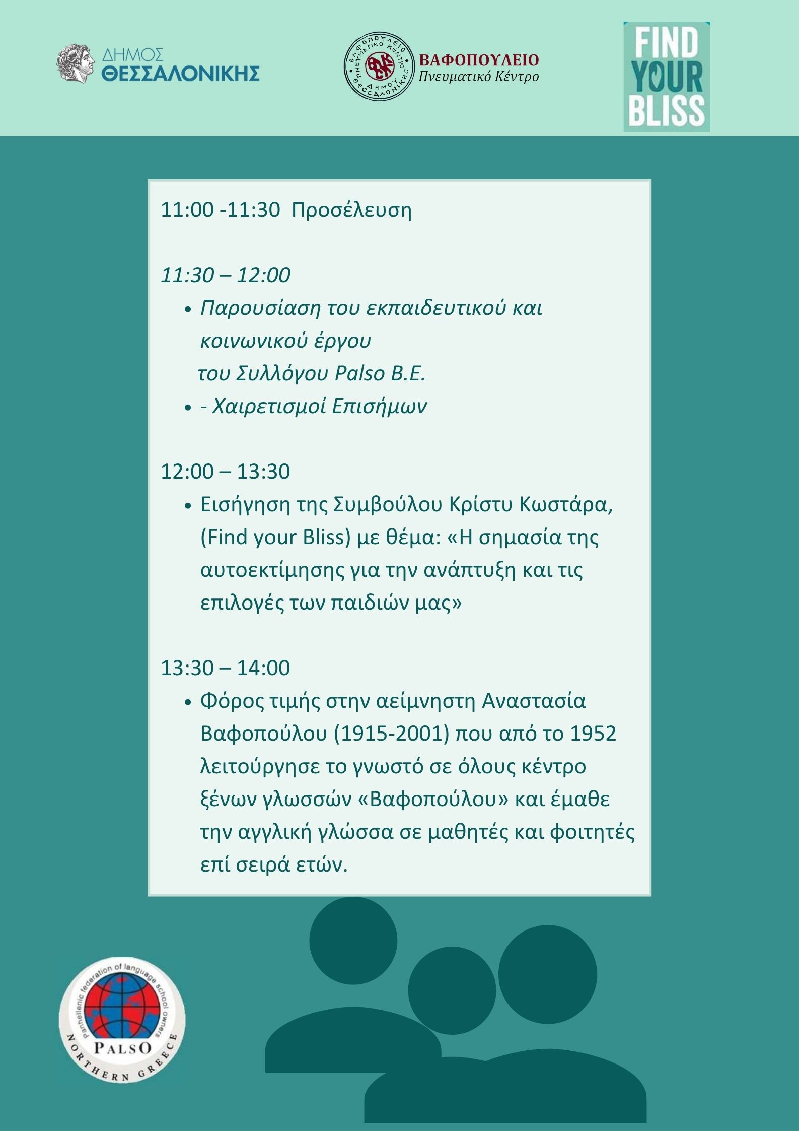 Εκδήλωση με τίτλο «Η σημασία της αυτοεκτίμησης για την ανάπτυξη και τις επιλογές των παιδιών μας» – Σχολές Γονέων διοργανώνει την Κυριακή 9 Νοεμβρίου 2025 το Βαφοπούλειο Πνευματικό Κέντρο σε συνεργασία με την Ε΄ Δημοτική Κοινότητα και το Σύλλογο Palso B.E.