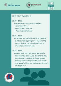Η εκδήλωση λόγου, που θα πραγματοποιηθεί στο θέατρο του Πνευματικού Κέντρου (Γ. Βαφόπουλου 3-5), στις 11:00, με ομιλήτρια την Σύμβουλο Επαγγελματικού Προσανατολισμού Ενδυνάμωσης και Ανθρώπινου Δυναμικού, Κρίστυ Κωστάρα, απευθύνεται σε γονείς, εκπαιδευτικούς και κάθε ενδιαφερόμενο, χωρίς οικονομική επιβάρυνση.
