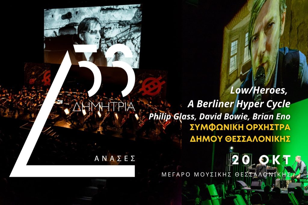 Ολοκληρώνεται το 56ο Φεστιβάλ Δημητρίων με την μουσική παράσταση «Low / heroes, A hyper-cycle Berlinois» Ένας μουσικός διάλογος των Philip Glass, David Bowie και Brian Eno, από τη Συμφωνική Ορχήστρα Δήμου Θεσσαλονίκης Ολοκληρώνεται το 56ο Φεστιβάλ Δημητρίων με τη μουσική παράσταση “ Low / heroes, A hyper-cycle Berlinois” η οποία αναδεικνύει τη σχέση μεταξύ των