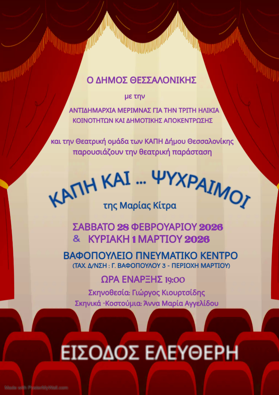 Η Θεατρική ομάδα των ΚΑΠΗ του Δήμου Θεσσαλονίκης παρουσιάζει την απολαυστική κωμωδία της Μαρίας Κίτρα, «ΚΑΠΗ ΚΑΙ … ΨΥΧΡΑΙΜΟΙ». Η παράσταση θα ανέβει το Σάββατο 28 Φεβρουαρίου και την Κυριακή 1 Μαρτίου 2026, στις 19:00, στο Βαφοπούλειο Πνευματικό Κέντρο.