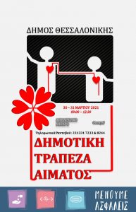 Η διήμερη δράση εθελοντικής αιμοδοσίας θα πραγματοποιηθεί την Τρίτη 30 και την Τετάρτη 31 Μαρτίου 2021 στο φουαγιέ του δημαρχιακού μεγάρου Θεσσαλονίκης με αυστηρή τήρηση όλων των προβλεπόμενων υγειονομικών πρωτοκόλλων.
