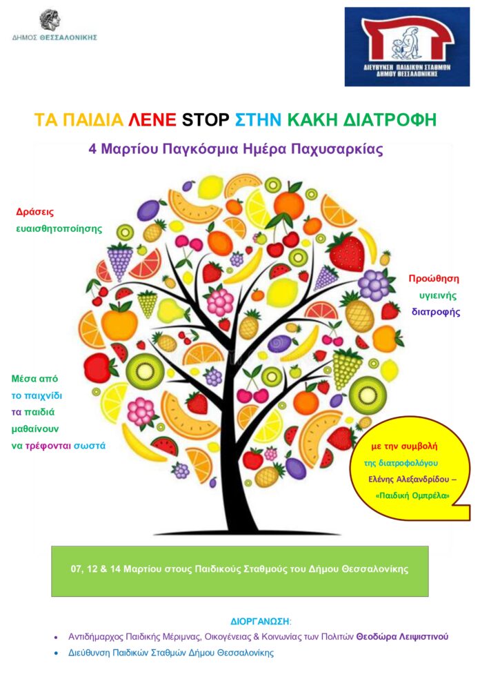 Με αφορμή την Παγκόσμια Ημέρα Παχυσαρκίας στις 4 Μαρτίου, η Αντιδήμαρχος Παιδικής Μέριμνας, Οικογένειας & Κοινωνίας των Πολιτών Θεοδώρα Λειψιστινού και η Διεύθυνση Παιδικών Σταθμών του Δήμου Θεσσαλονίκης σε συνεργασία με διατροφολόγου, διοργάνωσαν σειρά δράσεων ευαισθητοποίησης των φιλοξενούμενων παιδιών, για την προώθηση υγιεινής διατροφής στους δημοτικούς παιδικούς σταθμούς. Στόχοςήταν μέσα από το παιχνίδι, τα παιδιά να πάρουν ερεθίσματα ώστε να μάθουν να τρέφονται σωστά.