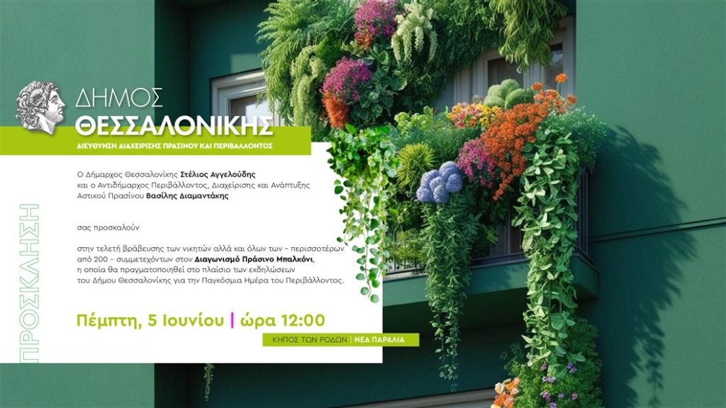 Σας περιμένουμε με χαρά την Πέμπτη 5 Ιουνίου στις 12:00, στον Κήπο των Ρόδων στη Νέα Παραλία, για την τελετή βράβευσης του Διαγωνισμού Πράσινο Μπαλκόνι, στο πλαίσιο της Παγκόσμιας Ημέρας Περιβάλλοντος.