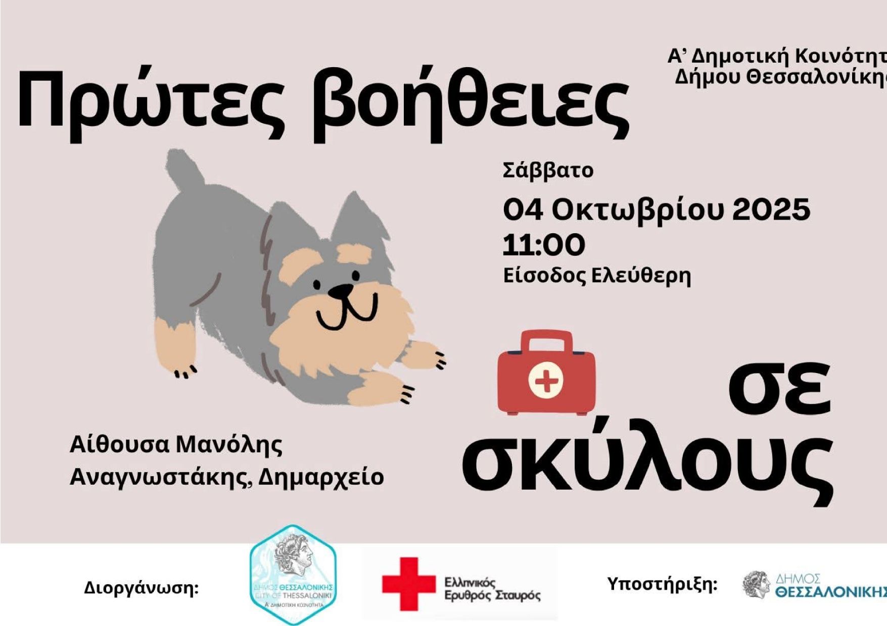 Το Σάββατο 4 Οκτωβρίου στις 11.00 π.μ. ο Δήμος Θεσσαλονίκης, η Α’ Δημοτική Κοινότητα και ο Ερυθρός Σταυρός σας προσκαλούν να γιορτάσουμε μαζί την Παγκόσμια Ημέρα Ζώων με ένα χρήσιμο σεμινάριο Πρώτων Βοηθειών για σκύλους.