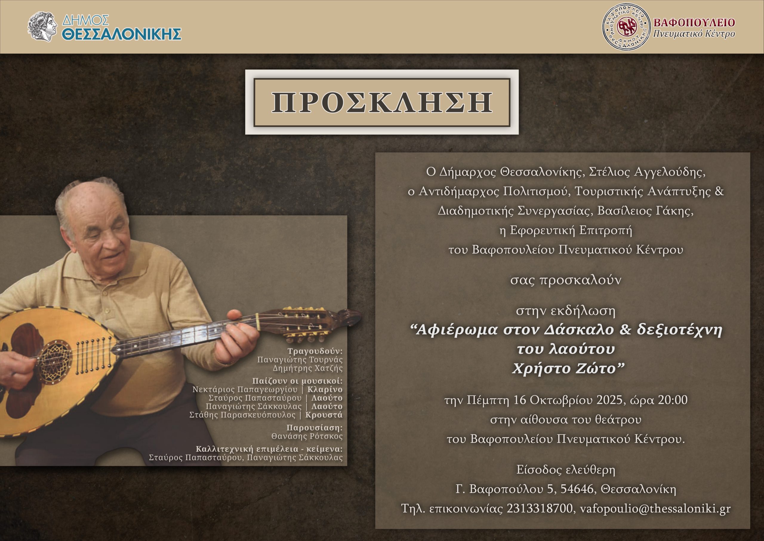 Συναυλία με τίτλο «Χρήστος Ζώτος. Αφιέρωμα στον Δάσκαλο & δεξιοτέχνη του λαούτου» διοργανώνει το Βαφοπούλειο Πνευματικό Κέντρο του Δήμου Θεσσαλονίκης σε συνεργασία με τους μουσικούς κ. Σταύρο Παπασταύρου και κ. Παναγιώτη Σάκκουλα, μαθητές του Χρήστου Ζώτου, την Πέμπτη 16 Οκτωβρίου 2025, ώρα 20:00, στην Αίθουσα Θεάτρου του Βαφοπουλείου (Γ. Βαφοπούλου 3-5).