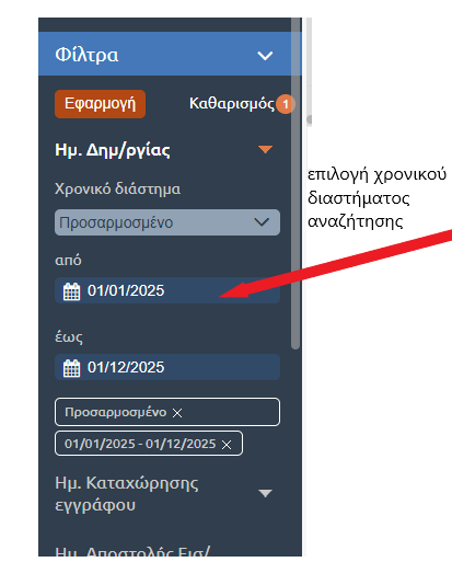 για την αναζήτηση παλαιότερων εγγράφων με αριθμό πρωτοκόλλου, χρησιμοποιούμε τα φίλτρα στα εργαλεία αριστερά κάτω από το πεδίο αναζήτηση. Στα φίλτρα επιλέγουμε το χρονικό διάστημα αναζήτησης (με δυνατότητα αναζήτησης σε διάστημα ενός χρόνου από την πρώτη ημερομηνία που ορίζουμε), πατάμε εφαρμογή για να ορίσουμε το φίλτρο και στη συνέχεια μπορούμε να επιλέξουμε το κριτήριο αναζήτησης (αρ. πρωτοκόλλου, θέμα εγγράφου κλπ) για να βρούμε το έγγραφο που ψάχνουμε