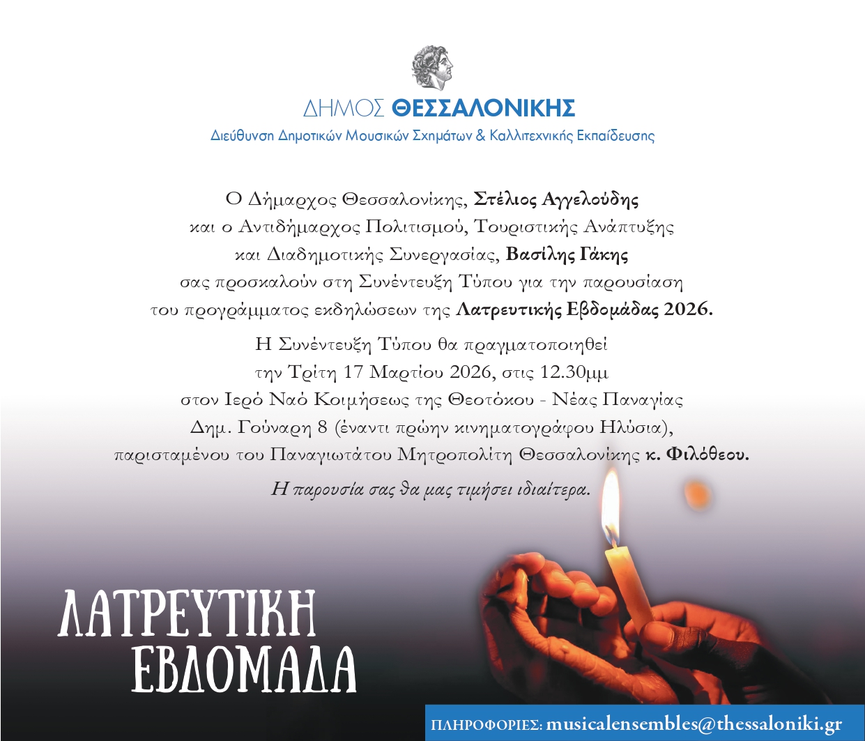 Στη συνέντευξη Τύπου θα συμμετάσχουν ο Δήμαρχος Θεσσαλονίκης Στέλιος Αγγελούδης, ο Αντιδήμαρχος Πολιτισμού, Τουριστικής Ανάπτυξης και Διαδημοτικής Συνεργασίας Βασίλης Γάκης και ο Παναγιώτατος Μητροπολίτης Θεσσαλονίκης κ. Φιλόθεος.