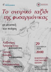 Εκδήλωση μουσικής και ποίησης με τίτλο «Το ονειρικό ταξίδι της φυσαρμόνικας» διοργανώνει το Βαφοπούλειο Πνευματικό Κέντρο του Δήμου Θεσσαλονίκης την Παρασκευή 29 Νοεμβρίου 2024, στις 20:00, στο θέατρο του (Γ. Βαφόπουλου 3-5).