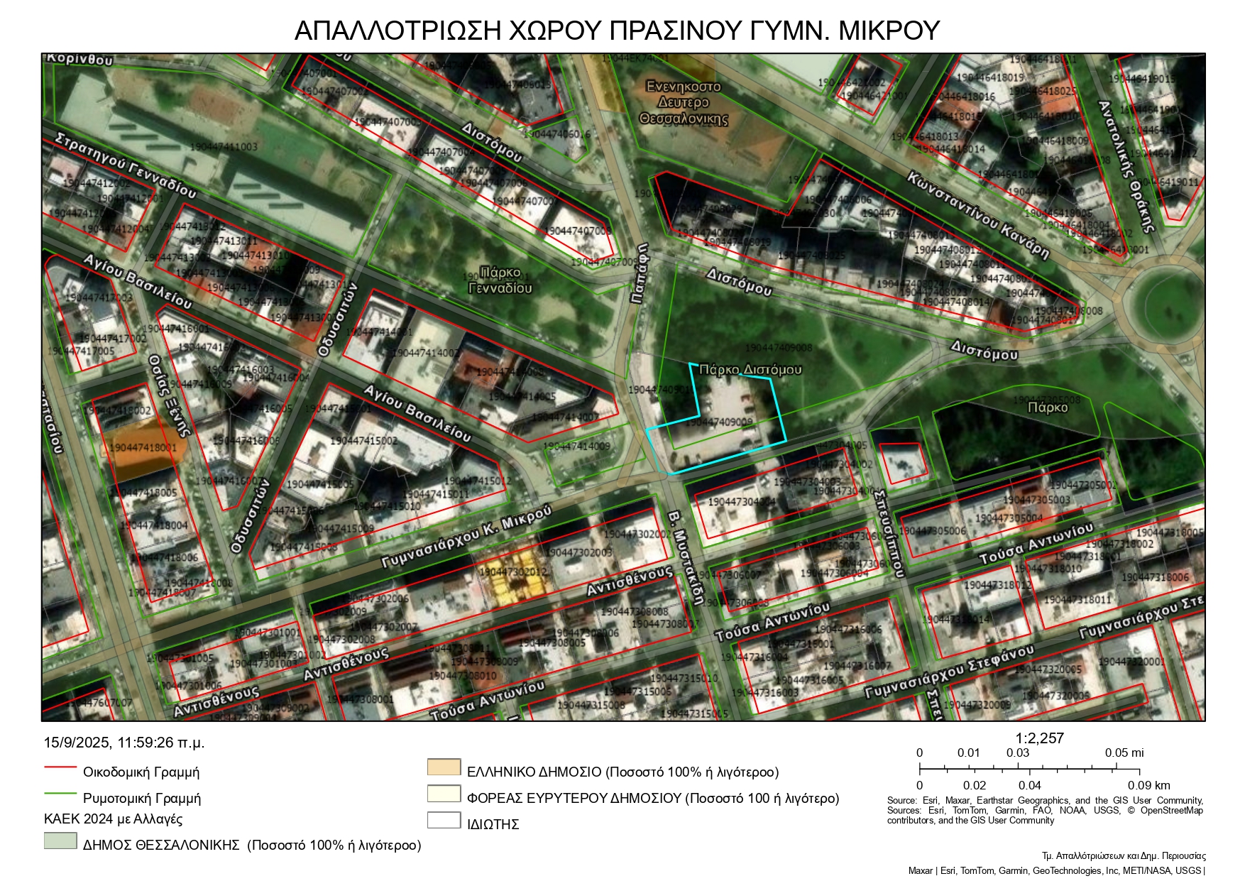 Το ακίνητο, συνολικής έκτασης 1.511,30 τ.μ., βρίσκεται στη συμβολή των οδών Γυμνασιάρχου Μικρού 15 και Γυμνασιάρχου Μυστακίδου, στην Ε’ Δημοτική Κοινότητα. Η περιοχή χαρακτηρίζεται από έντονη πολεοδομική επιβάρυνση και σοβαρό έλλειμμα ελεύθερων και κοινόχρηστων χώρων πρασίνου.