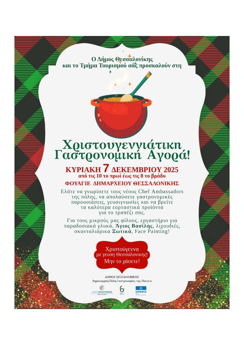 Σε μία κίνηση που συνδυάζει την εορταστική ατμόσφαιρα με τη στρατηγική ενίσχυση της τοπικής αγοράς, ο Δήμος Θεσσαλονίκης και το τμήμα Τουρισμού, διοργανώνει τη “Χριστουγεννιάτικη Γαστρονομική Αγορά”, στις 7 Δεκεμβρίου από τις 10.00 π.μ. έως τις 20.00, στο φουαγιέ του Δημαρχείου.
