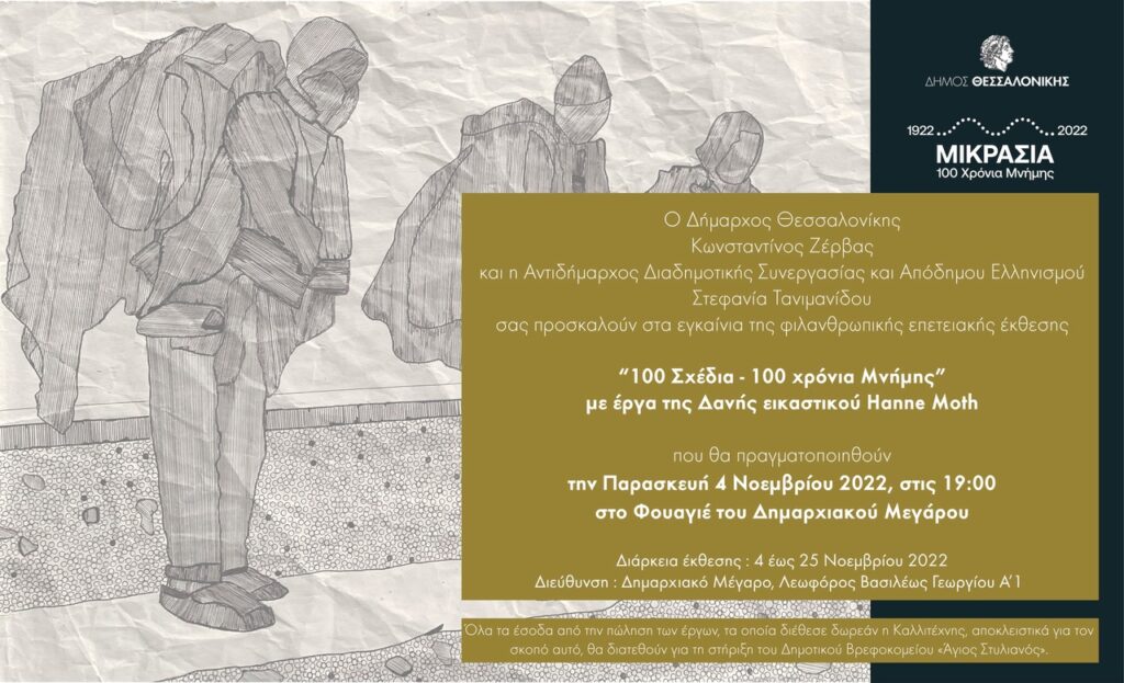 Την έκθεση «100 Σχέδια – 100 Χρόνια Μνήμης», που παράλληλα με τον επετειακό χαρακτήρα της έχει κι ένα έντονο κοινωνικό αποτύπωμα, παρουσιάζουν ο Δήμος Θεσσαλονίκης, η Αντιδημαρχία Διαδημοτικής Συνεργασίας και Απόδημου Ελληνισμού και η Δημοτική Πινακοθήκη σε συνεργασία με τη Δανή καλλιτέχνιδα Hanne Moth.