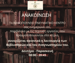 Το Βαφοπούλειο Πνευματικό Κέντρο παράλληλα με τις τεχνικές εργασίες που πραγματοποιούνται στο κτίριο συνεχίζει απρόσκοπτα τη λειτουργία του.