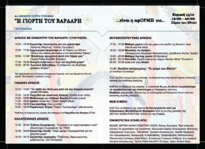 Η Β΄ Δημοτική Κοινότητα σε συνεργασία με την «Ομάδα Γειτονιάς του Βαρδάρη» του Προγράμματος Προαγωγής Αυτοβοήθειας Θεσσαλονίκης, για 4η συνεχή χρονιά, διοργανώνει τη Γιορτή του Βαρδάρη. Η γιορτή θα πραγματοποιηθεί την Κυριακή 13 Οκτωβρίου στο Πάρκο των Εθνών, στη συμβολή των οδών Λαγκαδά & Αγ. Δημητρίου και θα διαρκέσει από τις 12:00 το μεσημέρι μέχρι τις 22:00 το βράδυ.Το σλόγκαν της φετινής γιορτής είναι «Η γιορτή είναι η αφΟΡΜΗ». Αφορμή για συνάντηση, παιχνίδι, ψυχαγωγία, κοινωνικό προβληματισμό, γόνιμο διάλογο και συνεργασία. Η πληθώρα δράσεων που περιέχονται στην εκδήλωση (διαδραστικά εργαστήρια, ανοιχτές συζητήσεις κοινωνικο-πολιτικού προβληματισμού, καλλιτεχνικές δράσεις, παιδικές δραστηριότητες, πικ-νικ με συλλογική και διεθνή κουζίνα, κ.α.) είναι εμπνευσμένη τόσο από το πλούσιο παρελθόν της όσο και από το παρόν και το μέλλον της. Ευελπιστούμε να σας συναντήσουμε όλους εκεί!