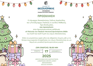 Ο Δήμος Θεσσαλονίκης δια της Αντιδημαρχίας Παιδείας και Δια Βίου Μάθησης και τα Κέντρα Δημιουργικής Απασχόλησης Παιδιών (ΚΔΑΠ και ΚΔΑΠ ΑμεΑ) ανακοινώνουν τη μεγάλη χριστουγεννιάτικη εκδήλωση «Η Πολιτεία των Παιδιών: Φωτεινά Χριστούγεννα 2025», η οποία θα πραγματοποιηθεί την Τετάρτη 17 Δεκεμβρίου 2025, στις 17.00 -21.00 (ώρα έναρξης εκδήλωσης 18.00), στην αίθουσα Μ. Αναγνωστάκης του Δημαρχείου Θεσσαλονίκης.