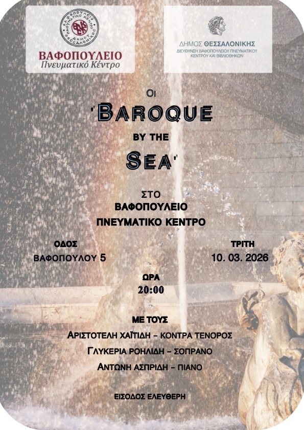 Το Βαφοπούλειο Πνευματικό Κέντρο διοργανώνει διαδραστικό ρεσιτάλ όπερας με τίτλο «BAROQUE BY THE SEA», την Τρίτη 10 Mαρτίου 2026, με τους Γλυκερία Ροηλίδη (σοπράνο), Αριστοτέλη Χαϊτίδη (κόντρα τενόρος) και Αντώνη Ασπρίδη (πιάνο).