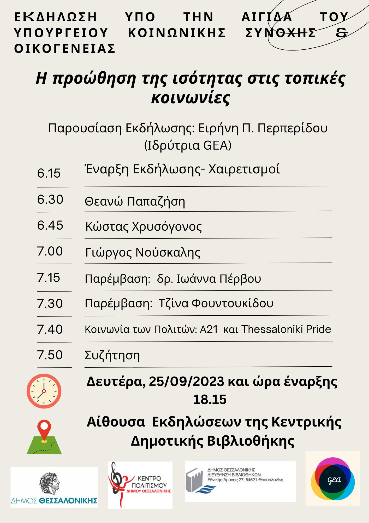 Ο Δήμος Θεσσαλονίκης, το Κέντρο Πολιτισμού του Δήμου Θεσσαλονίκης και η GEA (Gender Equality Assembly), διοργανώνουν εκδήλωση με θέμα «Η προώθηση της ισότητας στις τοπικές κοινωνίες» τη Δευτέρα 25 Σεπτεμβρίου 2023 και ώρα 18.00 στο αμφιθέατρο της Κεντρικής Δημοτικής Βιβλιοθήκης του Δήμου Θεσσαλονίκης, υπό την αιγίδα του Υπουργείου Κοινωνικής Συνοχής και Οικογένειας.