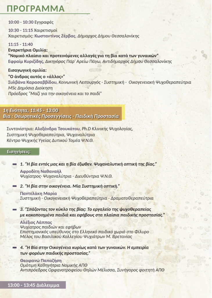 Η Κοινωνική Οργάνωση «Μαζί για την οικογένεια και το παιδί» σε συνεργασία με φορείς της Θεσσαλονίκης όπως:» Γυναίκες χωρίς Σύνορα», το Ορφανοτροφείο Θηλέων «Μέλισσα», το «Ελληνικό Παιδικό Χωριό» στο Φίλυρο, συνδιοργανώνουν Επιστημονική Ημερίδα, με θέμα τη Βία κατά των γυναικών, στις 7 Νοεμβρίου 2022, στην Αίθουσα Μανώλης Αναγνωστάκης του Δήμου Θεσσαλονίκης, από τις 10π.μ. έως 16.00μ.μ.