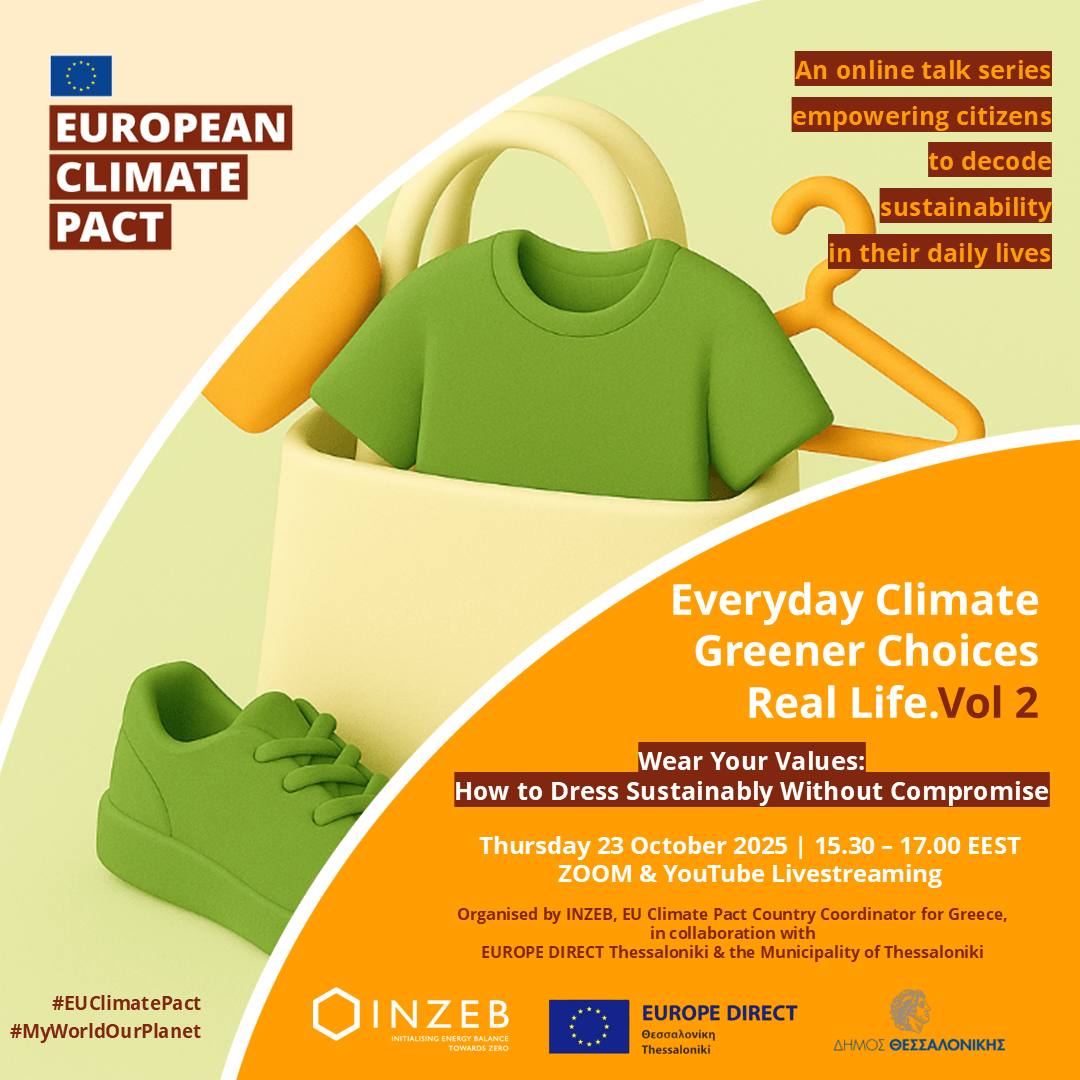 Με μεγάλη επιτυχία ολοκληρώθηκε την Πέμπτη, 23 Οκτωβρίου 2025, η διαδικτυακή εκδήλωση «Everyday Climate – Greener Choices, Real Life | Vol. 2: “Φόρεσε τις Αξίες σου: Πώς να Ντύνεσαι Βιώσιμα Χωρίς Συμβιβασμούς”», πρωτοβουλία του ΙΝΖΕΒ (INZEB), Εθνικού Συντονιστή του Ευρωπαικού Συμφώνου για το Κλίμα (EU CLIMATE PACT) σε συνεργασία με το EUROPE DIRECT Θεσσαλονίκης, Πρόγραμμα της Αντιδημαρχίας Παιδείας και Δια Βίου Μάθησης του Δήμου Θεσσαλονίκης.