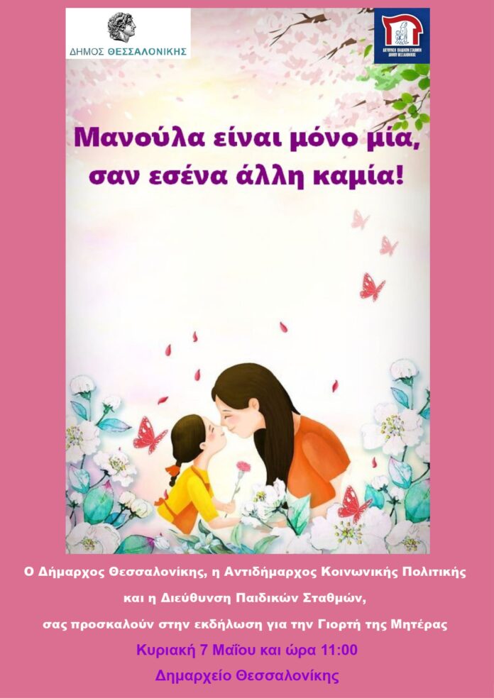Εκδήλωση αφιερωμένη σε όλες τις μητέρες διοργανώνει ο Δήμος Θεσσαλονίκης και η Διεύθυνση Παιδικών Σταθμών, εν όψει της γιορτής της μητέρας. Η εκδήλωση θα πραγματοποιηθεί την Κυριακή 7 Μαΐου, στις 11.00 στο Δημαρχείο Θεσσαλονίκης. Με σύνθημα τη φράση  “Μανούλα είναι μόνο μία, σαν εσένα άλλη καμία!” τα παιδιά των δημοτικών παιδικών σταθμών και οι παιδαγωγοί τους προετοίμασαν μια γιορτή γεμάτη μουσική και χρώμα. Στην εκδήλωση συμμετέχουν τα ΙΕΚ ΑΚΜΗ με ομάδα face painting για τα παιδιά.
