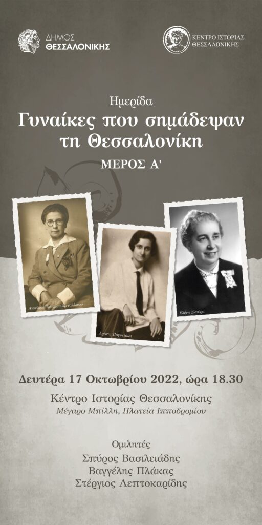 Το Κέντρο Ιστορίας του Δήμου Θεσσαλονίκης διοργανώνει ημερίδα αφιερωμένη σε τρεις εμβληματικές γυναίκες που σημάδεψαν με το έργο και τη δράση τους τη Θεσσαλονίκη. Η ημερίδα θα πραγματοποιηθεί τη Δευτέρα 17 Οκτωβρίου 2022, ώρα 18.30, στην αίθουσα εκδηλώσεων του Κέντρου Ιστορίας Θεσσαλονίκης (Μέγαρο Μπίλλη, Πλατεία Ιπποδρομίου).