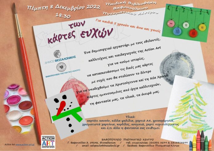 Η Παιδική Βιβλιοθήκη του Βαφοπούλειου Πνευματικού Κέντρου, μαζί με την Action Art, προσκαλούν την Πέμπτη 8 του Δεκέμβρη, το απόγευμα, στις 18:30 τους μικρούς φίλους, με τους γονείς τους, για να πούμε ιστορίες και να κατασκευάσουμε τις δικές μας κάρτες με ευχές που θα στολίσουν το δέντρο που θα υποδεχθεί τα Χριστούγεννα καi τη Νέα Χρονιά!