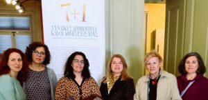 Όπως αναφέρει η Ιστορικός- κριτικός της Τέχνης και επιμελήτρια της έκθεσης Έλλη Κοκκίνη : “…Με τίτλο”7+1 γυναίκες δημιουργοί και οι αφηγήσεις τους”, οι καταξιωμένες στο χώρο της τέχνης Αγγελική Αυγητίδου, Βασιλική Δελερή, Αγάπη Μαυρουδή, Κατερίνα Μπουρατζή, Αγγέλικα Πράπα, Ευφροσύνη Σαπιρίδου-Τσίτση, Εύα Χαραλαμπίδου και Σταυρούλα Χρυσοπουλίδου, θέλησαν να ερμηνεύσουν, με την ιδεολογική και την αισθητική τους εξατομικευμένη στρατηγική και σε ποικίλα εκφραστικά πεδία, στοιχεία που συνδέουν, το χώρο της Casa Bianca, την ιστορία της και την ιστορία των κατοίκων της. Χρησιμοποιώντας ως εφαλτήριο τις τότε, κοινωνικές, οικονομικές και πολιτιστικές συνθήκες, προσδιόρισα και ανέλυσαν τις πολυπλοκότητες της σύγχρονης πραγματικότητας, καταφεύγοντας σε αφηγηματικούς κώδικες με έννοιες υποκρυπτόμενες, δημιουργώντας η κάθε μια την προσωπική της μυθοπλασία…”.