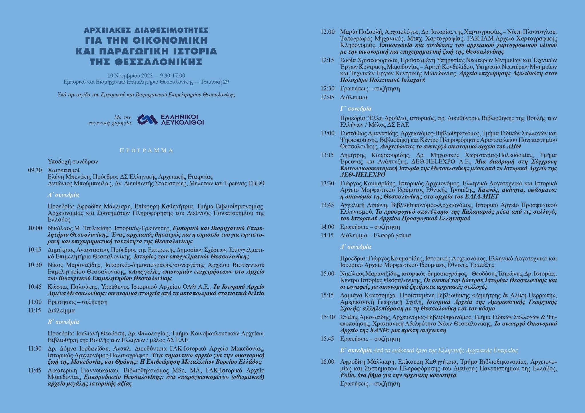 Πα10Νοε9:30 πμ5:00 μμΑρχειακές Διαθεσιμότητες για την Οικονομική και Παραγωγική Ιστορία της Θεσσαλονίκης