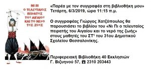 Τετάρτη 6/3/2019, ώρα 11:15. – 12:30 «Νι Πι ο τελευταίος πειρατής του Αιγαίου και το νερό της ζωής», Γιώργος Χατζόπουλος