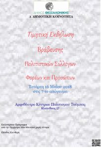 Η Δ΄ Δημοτική Κοινότητα με απόφαση του Συμβουλίου της, διοργανώνει Τιμητική Εκδήλωση βράβευσης 28 Φορέων, Πολιτιστικών Συλλόγων, Σωματείων και προσώπων για την ανιδιοτελή πολυεπίπεδη προσφορά, συμμετοχή και συνεργασία τους στην υλοποίηση των Πολιτιστικών και των άλλων δράσεων της Κοινότητας, την Τετάρτη 16 Μαΐου στις 7 το απόγευμα στο Αμφιθέατρο του Κέντρου Πολιτισμού Τούμπας.