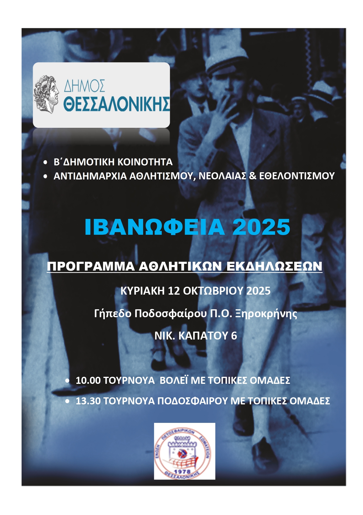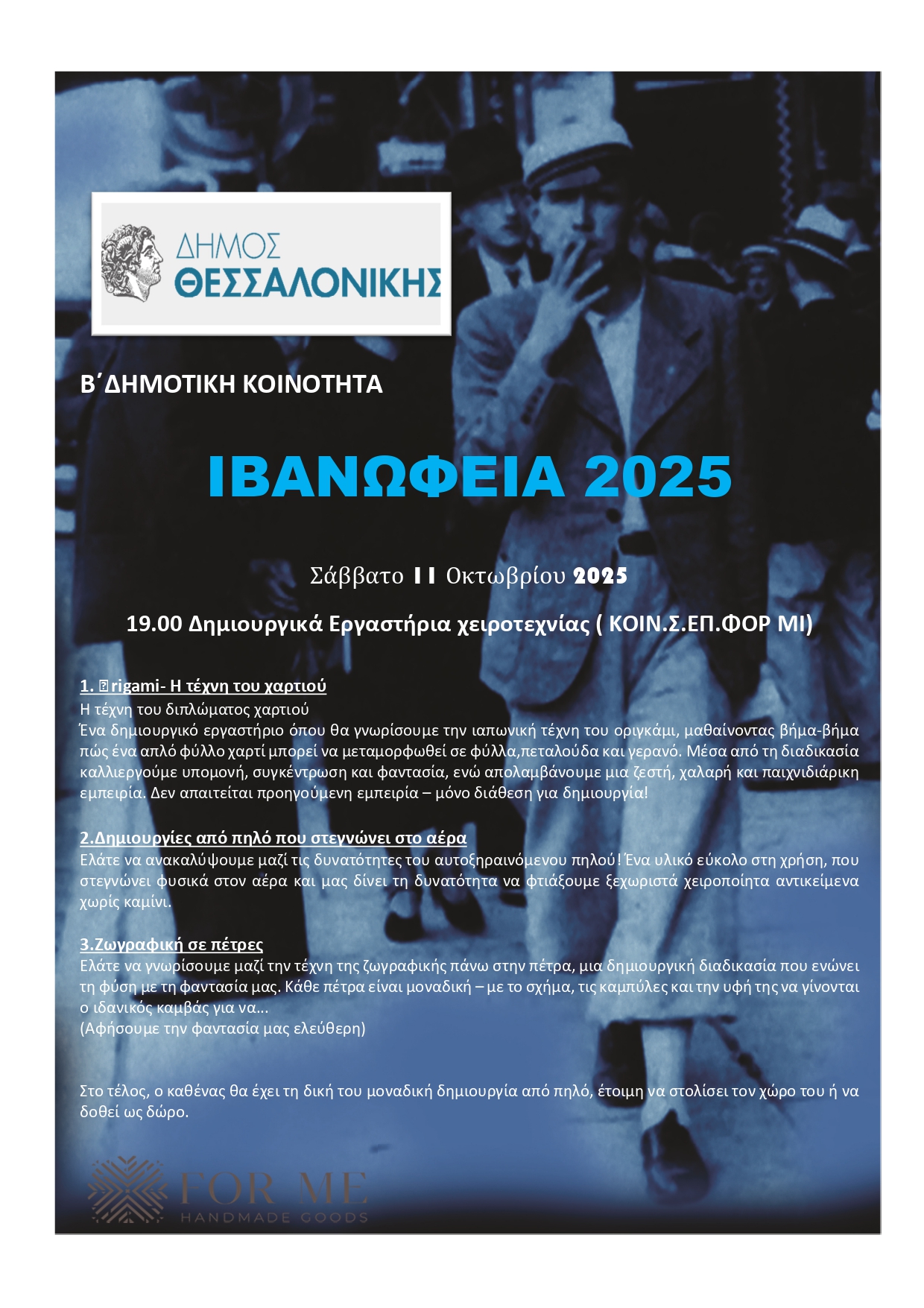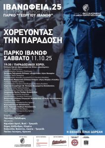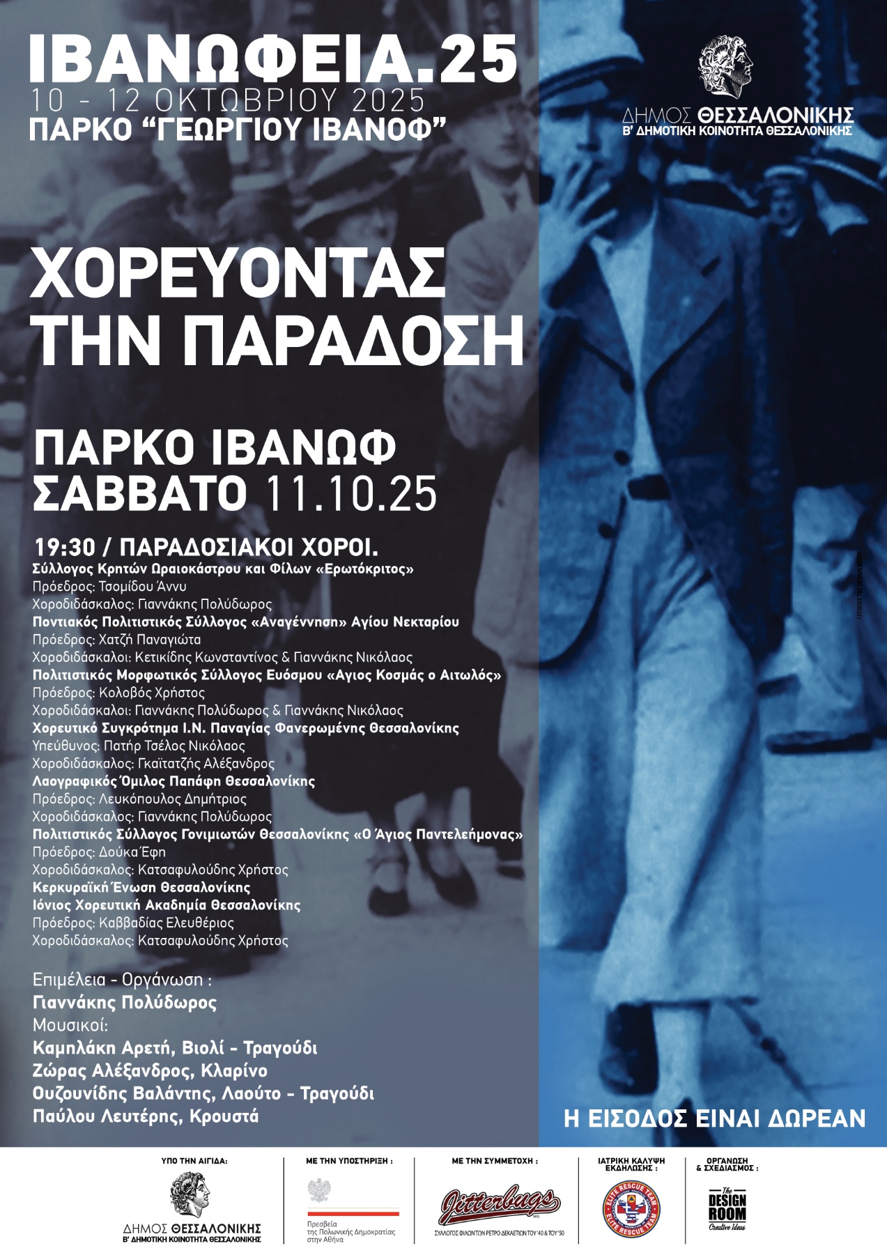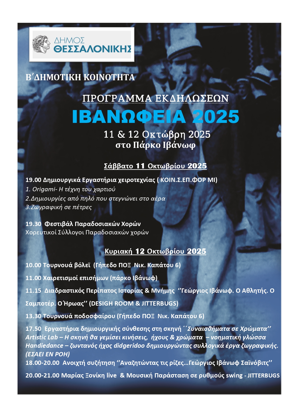 Ο Δήμος Θεσσαλονίκης και η Β΄Δημοτική Κοινότητα θα διοργανώσουν για 2η συνεχή χρονιά, τις εκδηλώσεις ”ΙΒΑΝΩΦΕΙΑ & ΦΕΣΤΙΒΑΛ ΠΑΡΑΔΟΣΙΑΚΩΝ ΧΟΡΩΝ 2025” στο πάρκο Ιβάνωφ (οδός Λαγκαδά – Αγ. Νέστορος) στις 11 και 12 Οκτωβρίου 2025. Κατά την διάρκεια των εκδηλώσεων θα πραγματοποιηθούν διάφορες δράσεις.