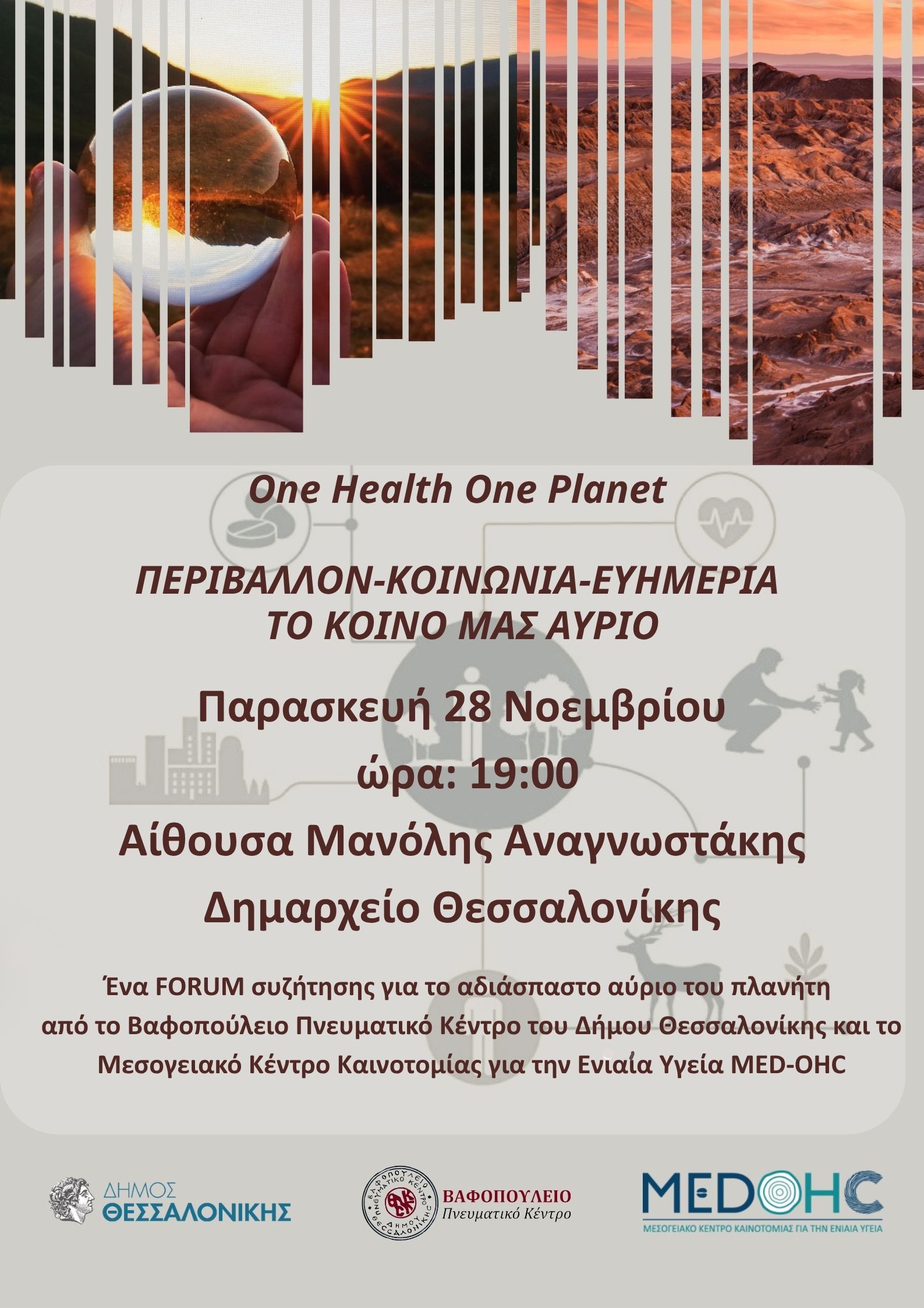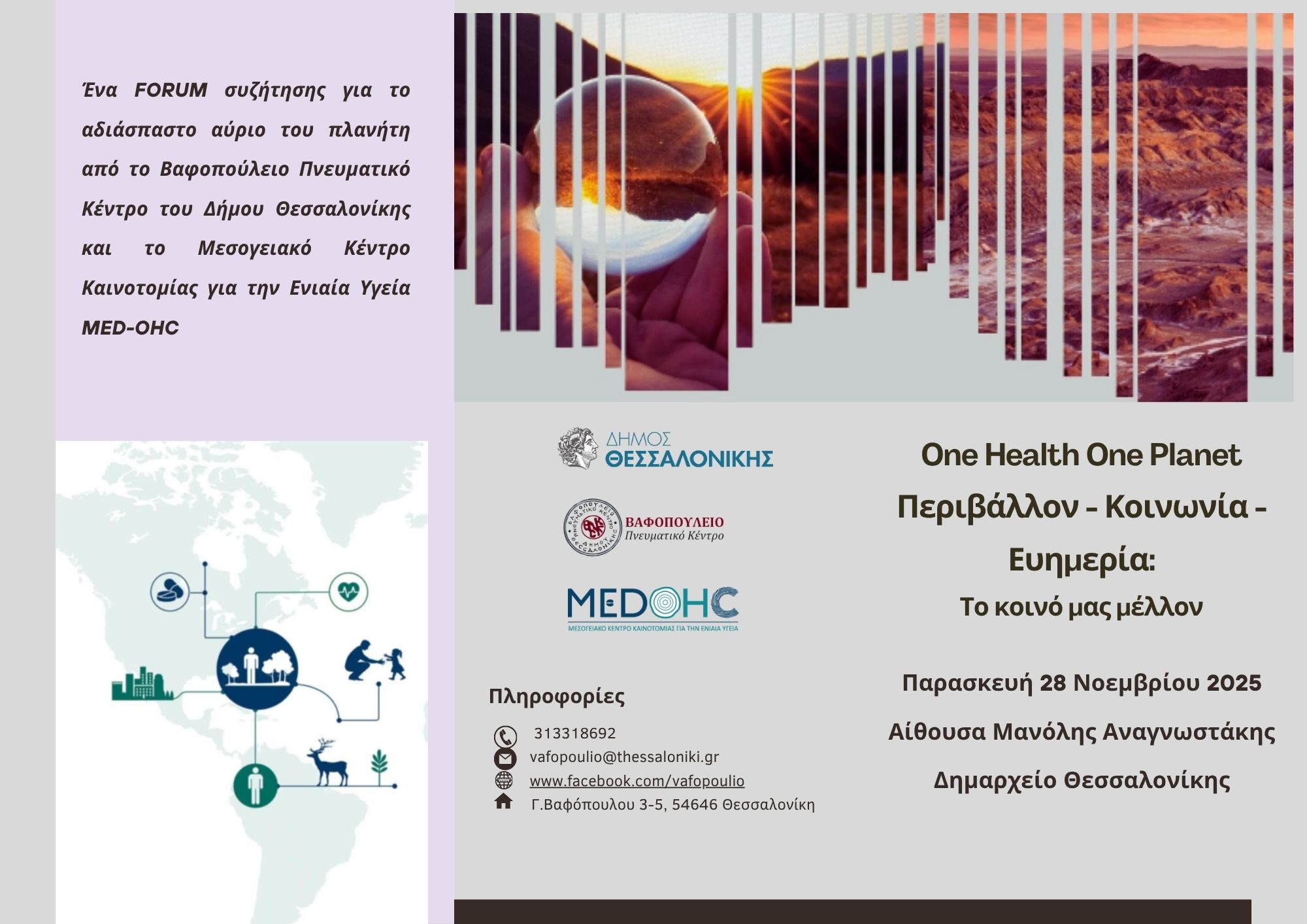 Το Βαφοπούλειο Πνευματικό Κέντρο σε συνεργασία με το Μεσογειακό Κέντρο Καινοτομίας για την Ενιαία Υγεία (MED-OHC) διοργανώνει Forum με θέμα «One Health One Planet, Περιβάλλον-Κοινωνία-Ευημερία: Το κοινό μας μέλλον» την Παρασκευή 28 Νοεμβρίου 2025.