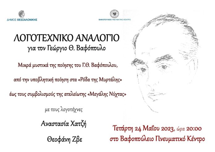 Λογοτεχνικό αναλόγιο με τίτλο «Μικρά μυστικά της ποίησης του Γ.Θ. Βαφόπουλου», από την υποβλητική ποίηση στα «Ρόδα της Μυρτάλης» έως τους συμβολισμούς της ατελείωτης «Μεγάλης Νύχτας»», θα πραγματοποιηθεί από το Βαφοπούλειο Πνευματικό Κέντρο την Τετάρτη 24 Μαΐου 2023.