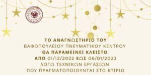 Το Βαφοπούλειο Πνευματικό Κέντρο ενημερώνει τους φίλους του Αναγνωστηρίου του, πως η λειτουργία του αναστέλλεται, για το μήνα Δεκέμβριο, λόγω των τεχνικών εργασιών που πραγματοποιούνται στο κτίριο.